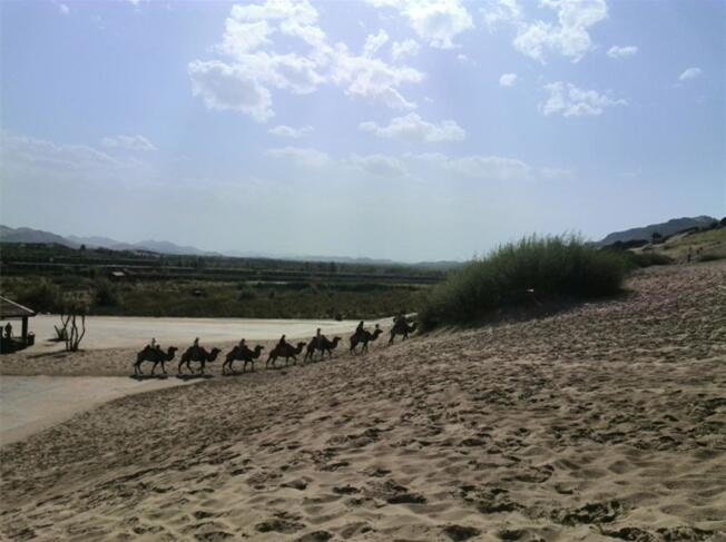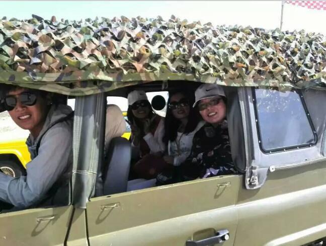 車子駛進(jìn)玉龍沙湖的停車場,我的思緒由漫漫歷史回到眼前景色。小小的一個湖,大大的看不到邊際的沙漠。據(jù)說這就是歷史上有名的科爾沁草原,現(xiàn)在也只能叫科爾沁沙地了吧。湖水的面積越來越小,湖水周圍一片小小的綠洲,綠洲外圍就是望不到邊際的沙漠。在我們出行前,旅行社的對這里的描繪是這個樣子:“讓您感受茫茫大漠、沙丘滾滾,連綿起伏的雄渾與壯美,金黃色的沙坡掩映在藍(lán)天、白云下,有一種茫茫沙海入云天的壯麗景象。觀賞陰石、陽石、石長城等沙漠奇觀,體驗(yàn)夢幻沙漠所帶來的無限驚奇!边@里說說的我的實(shí)際感受:沙子很白很細(xì),光著腳踩上去很燙,爬到沙坡上面,我的腳已被燙的發(fā)紅。站在沙坡上面遠(yuǎn)望,沙丘滾滾,連綿起伏是真實(shí)場景,但是我卻不能和雄渾、壯美等詞匯聯(lián)系在一起,也許是受后邊幾日景色的干擾,也許是在港城海邊也有很多沙地的原因,沙地并不算這幾天旅行中的美景。在玉龍沙湖的游覽中有兩點(diǎn)最記憶猶新:越野車和兩部電影的外景地。這里有兩個自費(fèi)項(xiàng)目,越野車和騎駱駝,我選擇了越野車。交了錢分了組后,我和馬姐、小費(fèi)、小霍四人一車,聽導(dǎo)游說越野車很怕人,那三人就一下做到了后排,我只好做到副駕駛位置。記好安全帶后,司機(jī)帶我們沖進(jìn)沙漠深處,一開始道路還算平緩,我們的心也是平緩的,坡度逐漸陡峭起來,后排三位的叫聲也越發(fā)尖銳,突然一個幾乎90度的坡沖下,車子似乎好像失去了重力,直接下去了,后排三位女士的聲音已經(jīng)不只尖銳了,近乎聲嘶力竭,我坐在前排,可能是能看到下邊的原因,并沒有覺得如此可怕,只是覺得很爽。越野車就這樣起起伏伏的狂奔了20分鐘又回到了遠(yuǎn)點(diǎn),驚險刺激,對的起120元的價位。這里是電影《萬物生長》和《后會無期》的外景地,《萬物生長》中范冰冰和韓庚的激情戲就是在這片沙子中拍攝的,就沖這個我也要光腳在沙堆上走一走;據(jù)劉繼偉說他看到了《后會無期》中的那顆衛(wèi)星,我卻已經(jīng)走累了,不去再看那顆衛(wèi)星了和大伙坐在山地旁邊的亭子里休息,順便看看別人騎駱駝。不到4點(diǎn)的功夫我們都已經(jīng)從景區(qū)出來了,坐車去往翁牛特旗的旗政府烏丹吃飯休息。